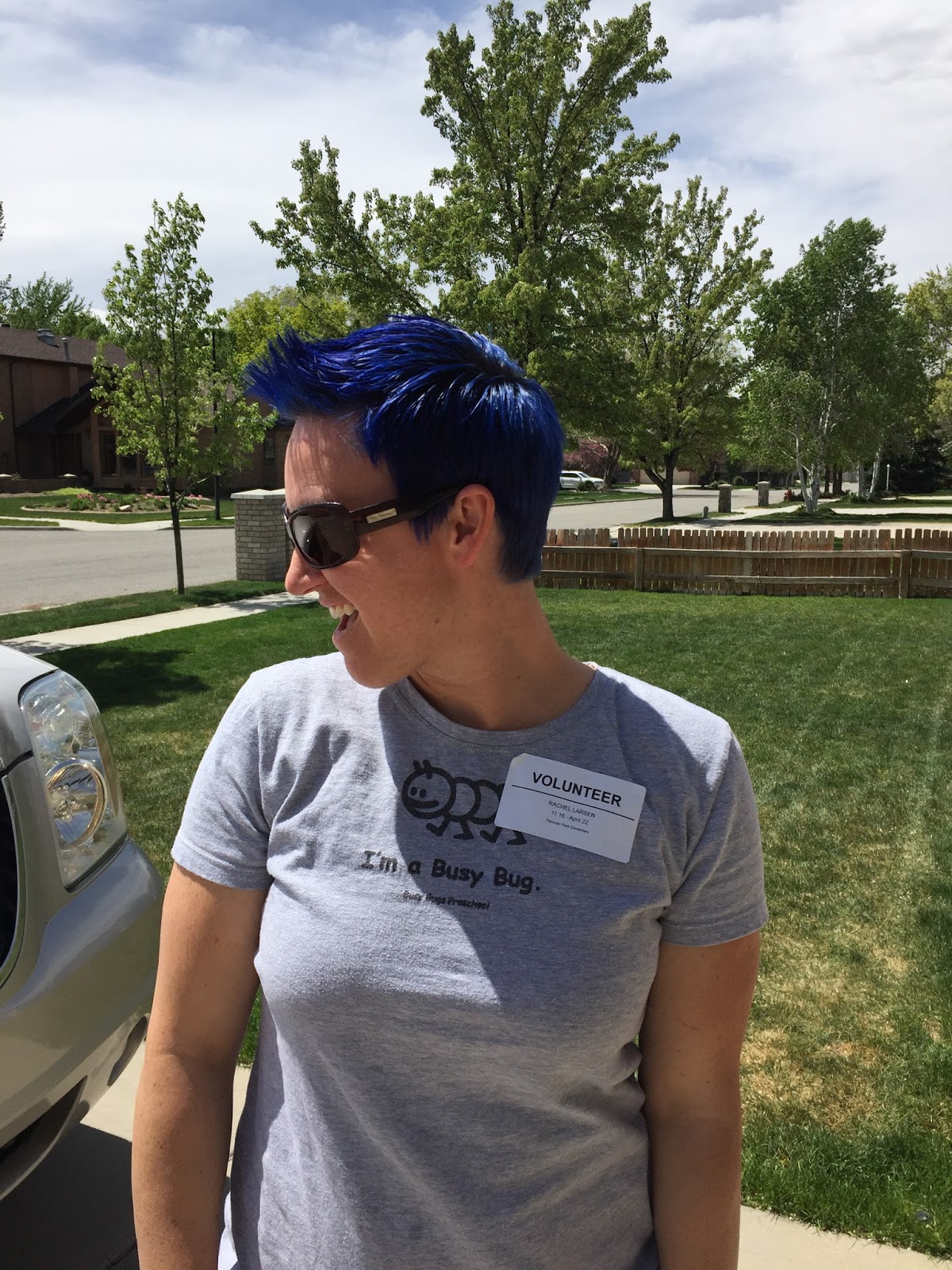 If you look closely at that purple, you'll see it's rather, um, bright. I happen to have a shirt the exact same unearthly hue, and believe it or not, the day after we dyed it I threw on my purple shirt. Without remembering my hair was purple.More than half-way through the busy Saturday, standing in front of my reflection at a paint store window, I looked up. My shirt matched my hair. Exactly matched my hair.
